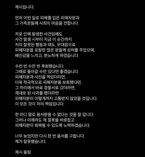 사건 발생 후 제시는 첫 번째 사과문을 발표했습니다. 그녀는 피해자와 그 가족에게 깊은 사죄의 마음을 전하며, 자신이 사건을 방관한 것에 대해 후회한다고 밝혔습니다. 이 사과문은 그녀의 진심 어린 마음을 담고 있었으나, 여전히 많은 팬들은 그녀의 행동에 실망감을 느꼈습니다.