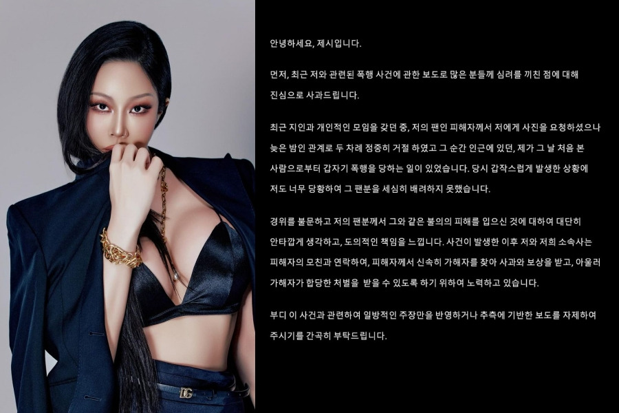 제시, 팬 폭행 사건 연루에 사과 "가해 남성 처음 본 사람…도의적 책임 느껴"