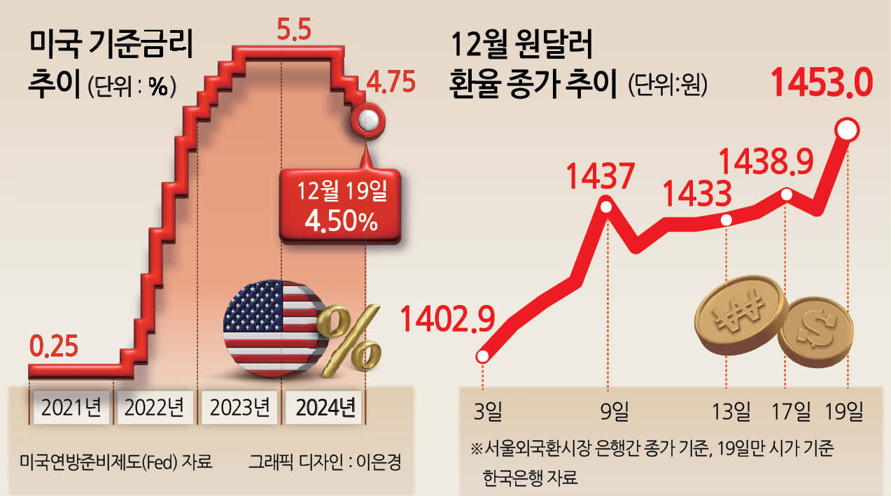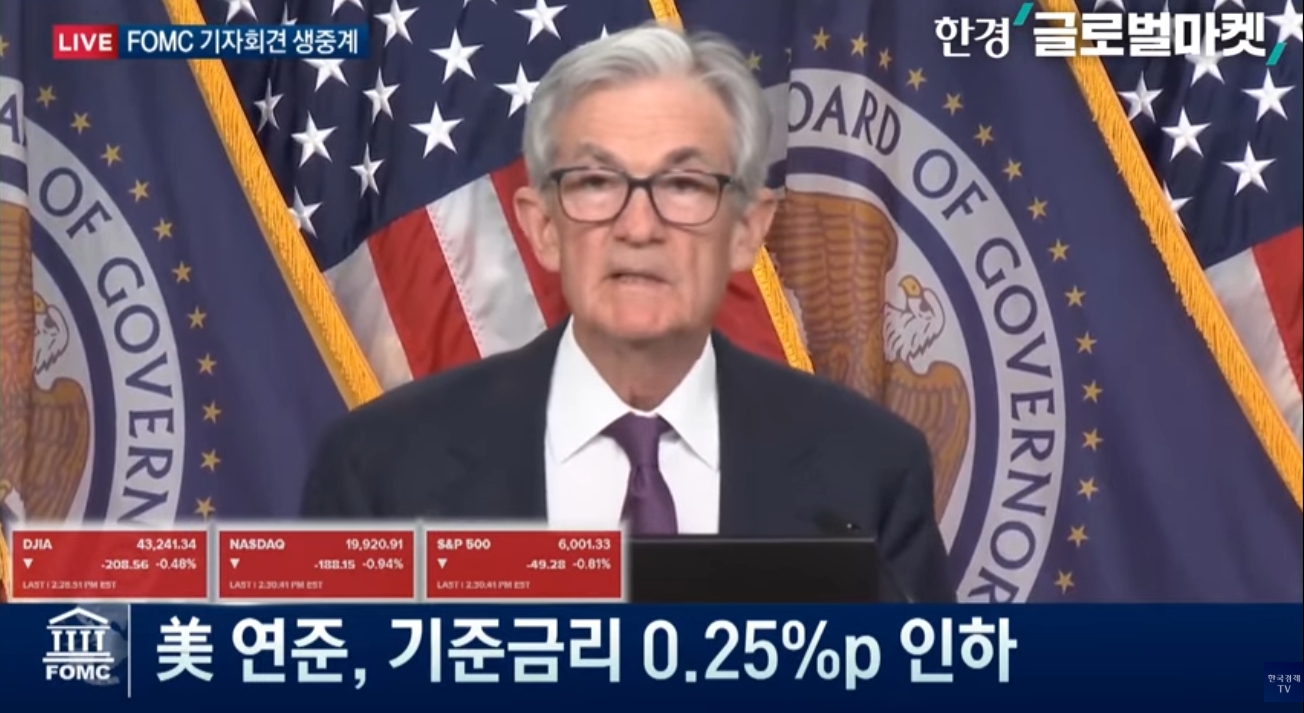 美연준, 기준금리 0.25%P 인하 “내년 인하전망 4회→2회로 축소” 파월 발언에 원달러 환율 급등 정부 “외환수급 방안 개선 추진” 환율이 한국 경제 ‘최대 리스크’ 미국 연방준비제도(Fed·연