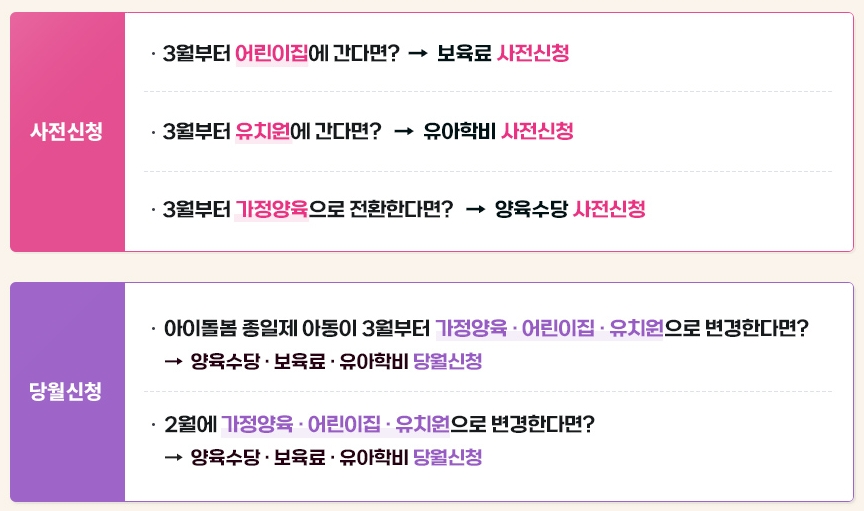 아이 돌봄 종일제 아동이 3월부터 가정양육, 어린이집, 유치원으로 변경 예정이라면 양육수당, 보육료, 유아학비 당월 신청