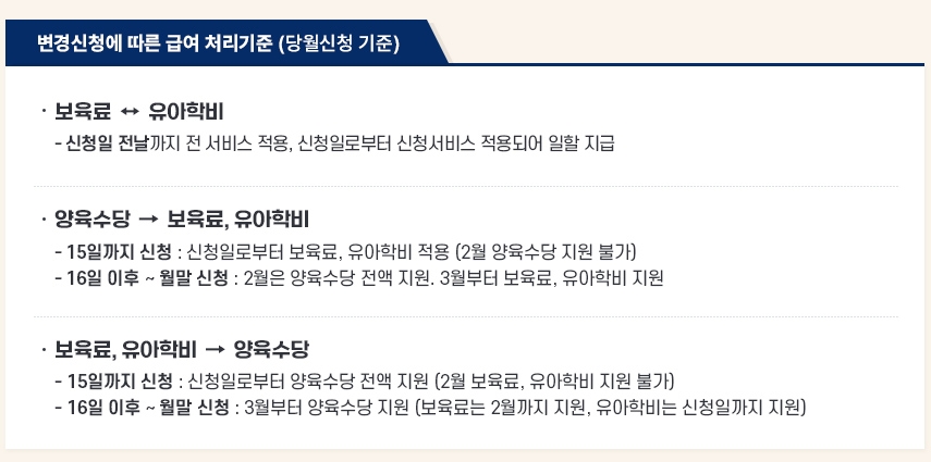 2월에 가정양육, 어린이집, 유치원으로 변경한다면 양육수당, 보육료, 유아학비 당월 신청
