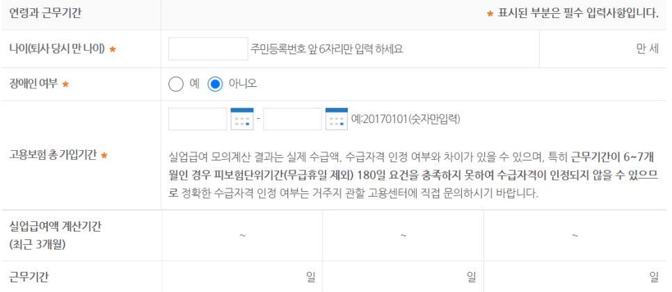- 주민번호 앞자리, 장애인 여부, 고용보험 가입기간을 입력합니다.