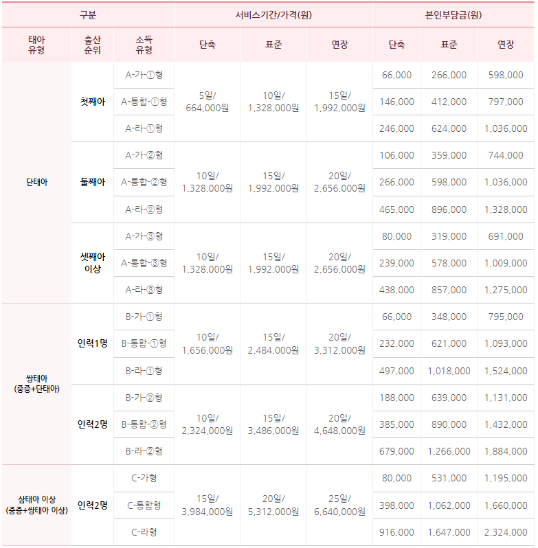 | 서비스 유형 | 첫째아 | 둘째아 | 기간 (일수) | 총 비용 (원) |