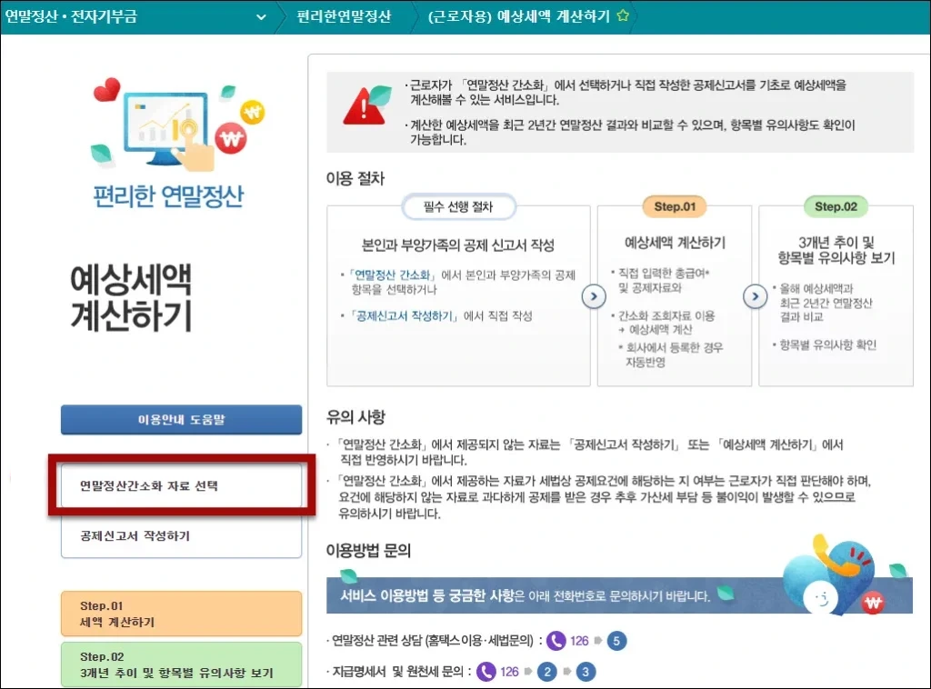 접속을 하게 되면 아래 그림과 같이 예상세액 계산하기 버튼과 함께 연말정산 자료 선택 방법이 안내되어 있습니다. 이 서비스를 이용하면 예상세액을 미리 계산해 볼 수 있고, 보다 효율적으로 연말정산을 준비할 수 있습니다.